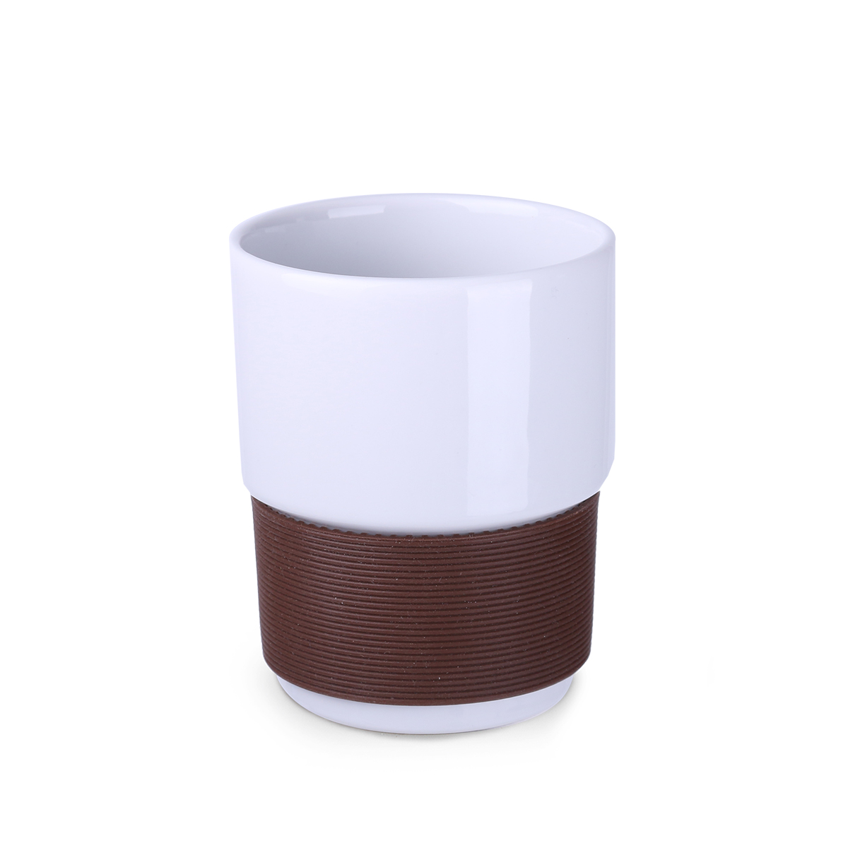 Medium size ceramic advertising mug without handle. The 40mm wide bands are available in 7 colors: white, orange, red, green, navy blue, brown and black.